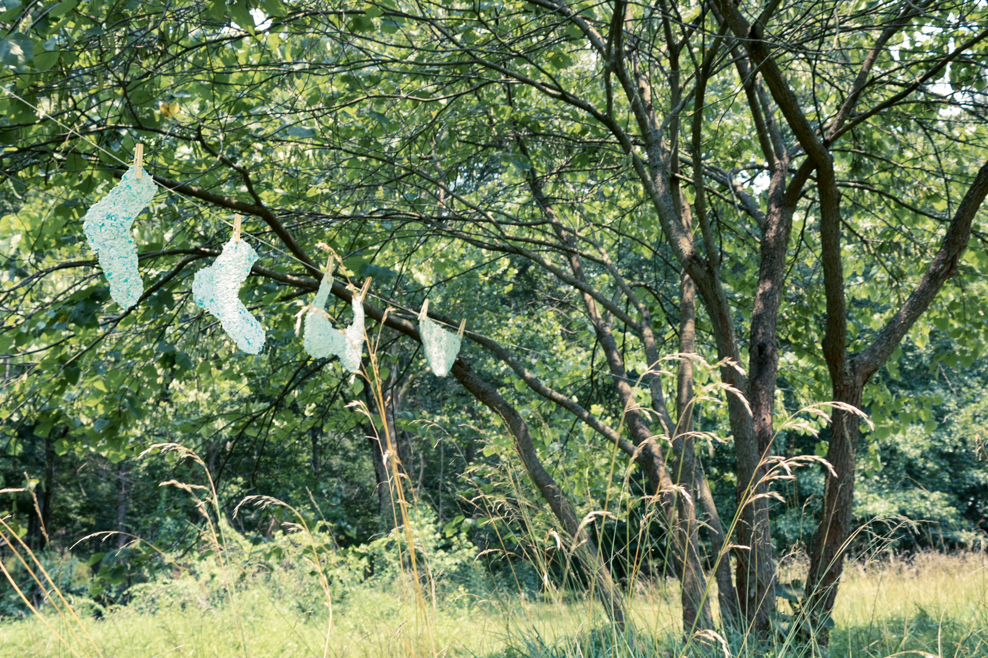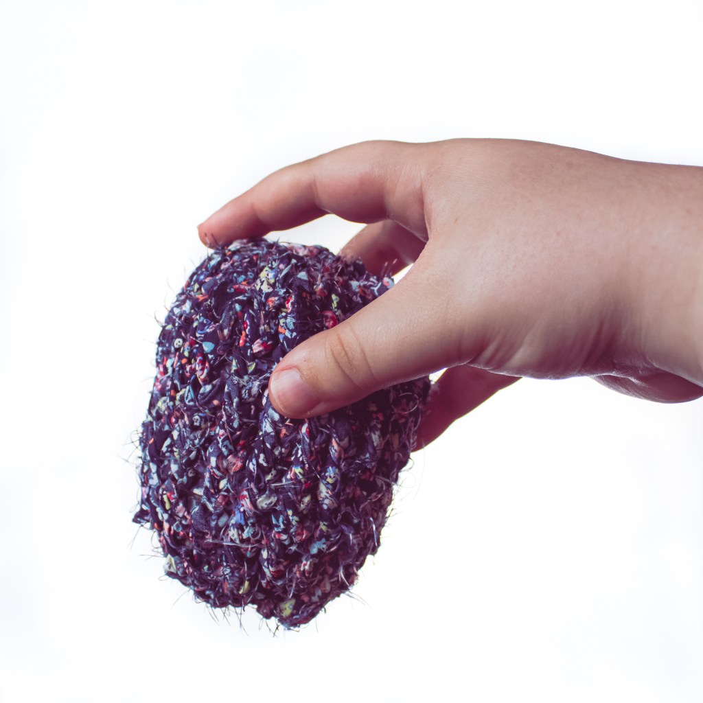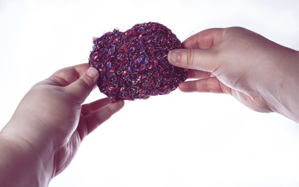 An unraveled, forgotten sweater crocheted into two doilies and wound around a glass bottle